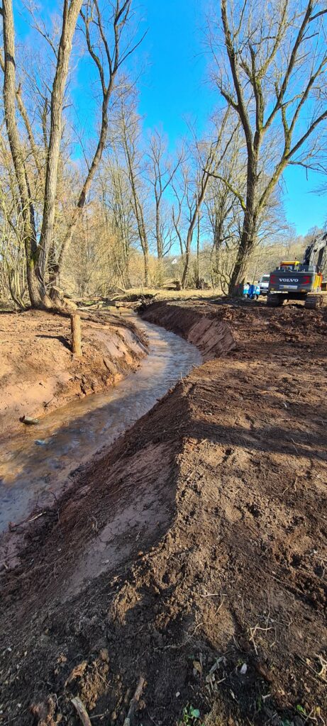 Die Gesamtmaßnahme wurde im November 2023 durch den Rückbau des Absturzes an der Mühle in Töppeln fertiggestellt. Die Umsetzung der WRRL und damit der Rückbau von Querbauwerken war auch hierbei das Ziel. Die Höhendifferenz des Absturzes betrug ca. 1 m. Die Sohle wurde mittels einer Schüttung aus Wasserbausteinen hergestellt. Die marode östliche Ufermauer wurde auf ihrer gesamten Länge abgebrochen und die dadurch entstehende neue Böschung mit Wasserbausteinen gesichert. Im Kontaktbereich der Brücke wurde vor dem Gebäude ein Betonfundament gefertigt.